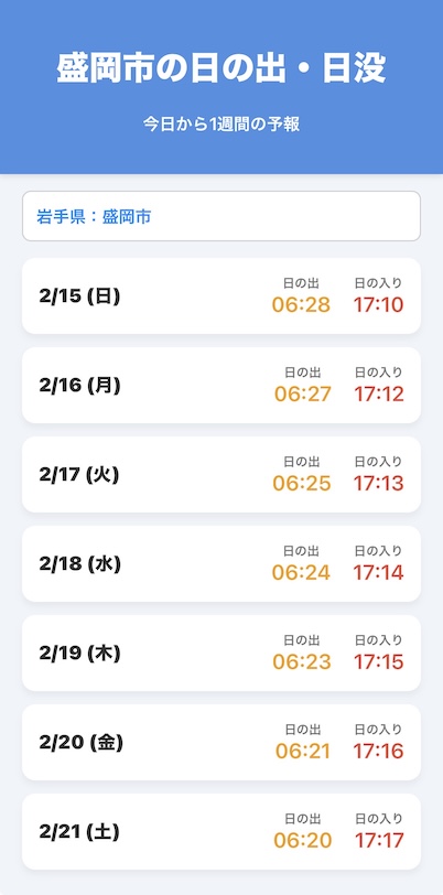 これで、スマホのホーム画面にアイコンが現れ、タップするだけでその日から1週間分の盛岡の日の出・日の入り時刻がいつでも確認できるようになります。